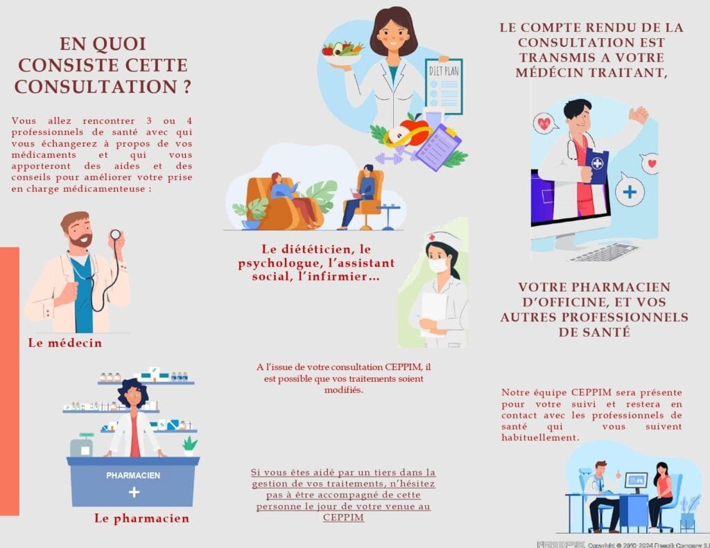 Concrètement, le CEPPIM propose une consultation pluriprofessionnelle au cours de laquelle le patient rencontre plusieurs soignants — médecin, pharmacien, diététicien, infirmier, psychologue ou assistant social — afin d’échanger sur ses traitements et de bénéficier d’un accompagnement personnalisé. Le compte rendu est ensuite transmis au médecin traitant et aux autres professionnels de santé impliqués dans le suivi.